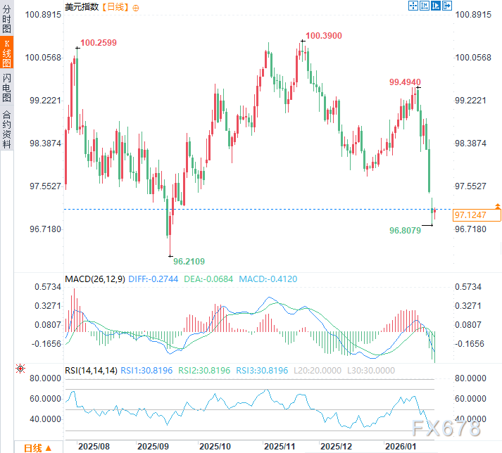 汇通财经APP讯——周二(1月27日)亚欧时段,美元指数于97.10附近窄幅震荡,此前三个交易日显著下行,一度触及逾四个月低点96.81,近期创下自2025年春季以来最急剧的短期跌幅之一。在主要货币篮子中,美元正经历自2025年4月以来最大的三日跌幅,当时美国总统唐纳德·特朗普的关税声明引发了美国资产的广泛抛售。