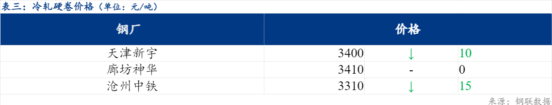 今日北方市场冷轧基料3.0*1010*CSPHC河北普阳价格为3190元/吨,较上一期价格下跌10元/吨,河北纵横价格为3180元/吨,较上一期价格下跌10元/吨。镀锌方面,今日北方钢厂指导价格部分下跌20元/吨;轧硬方面,当前主流报价3310-3410元/吨。市场方面,贸易商采购意愿下降,季节性效应明显,贸易商操作上以出货保成交为主,北方大户日成交300吨,心态上仍较为谨慎,钢厂方面来看,鞍山神龙钢厂镀锌有检修情况,其余民营钢厂正常生产当中,供给端有一定压力。