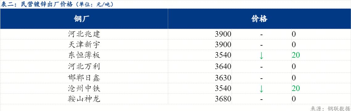 今日北方民营钢厂镀锌出厂指导价在3540-3900元/吨。