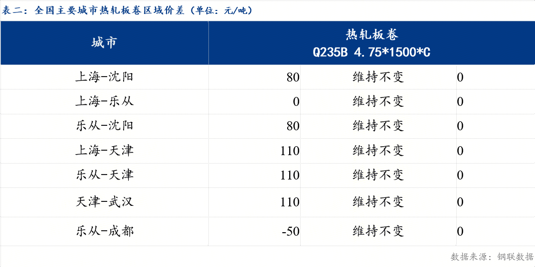 从区域价差来看,华东与东北价差80元/吨,较上一交易日维持不变;华东与华南价差0元/吨,较上一交易日维持不变;华南与华北价差为110元/吨,较上一交易日维持不变 。