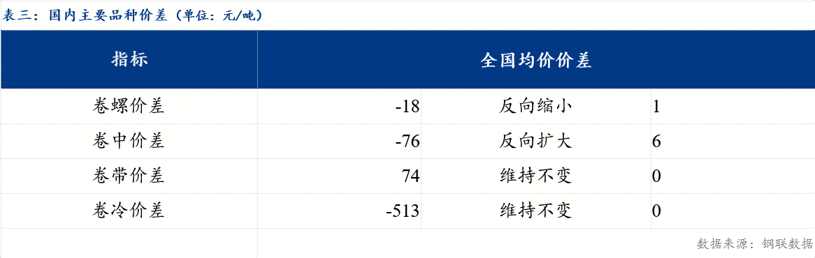 从品种价差来看,卷螺差较上一交易日反向缩小1元/吨,热中价差较上一交易日反向扩大6元/吨,热带价差较上一交易日正向缩小2元/吨 ,热冷价差较上一交易日反向缩小3元/吨。