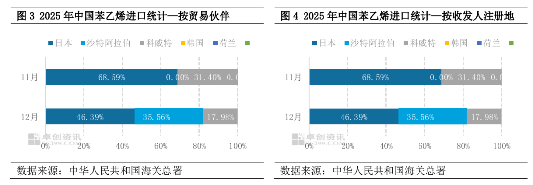 从进口来源看,集中度空前提高。中东区域国家凭借其成本优势,占当月进口总量的53.24%,成为最主要的供应地区,其中沙特阿拉伯占比35.56%,科威特占比在17.98%;其余进口主要来自运距较近的日本,占比在46.39%。这表明我国苯乙烯进口已从过去的“多源补充”转变为对低成本货源的依赖。12月以一般贸易方式进口量占比在100%,环比提升15.26个百分点。
