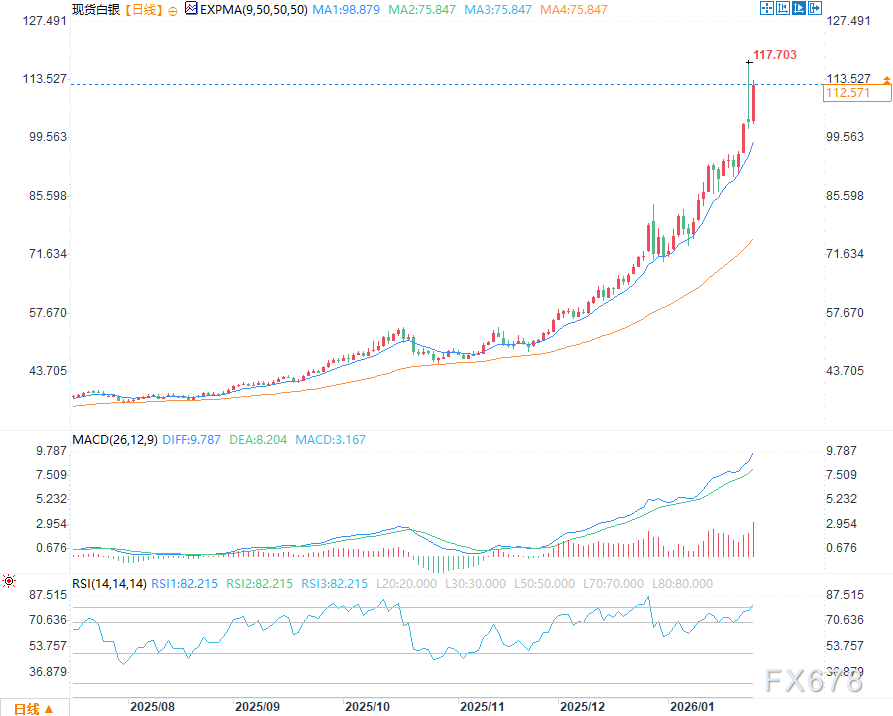 汇通财经APP讯——2026年伊始,白银价格出现历史罕见的加速上涨。1月尚未结束,白银累计涨幅已接近50%,月内振幅高达40%。在美元走弱、实际利率下行、黄金强势以及工业端供需担忧持续发酵的背景下,价格被快速推升至前所未有的高位。然而,伴随而来的极端波动与技术性过热信号,正成为今年对白银多头的第一次真正压力测试。当前更值得关注的,并非趋势是否立刻反转,而是市场是否正在从单边上涨,转向高位消化与再平衡。