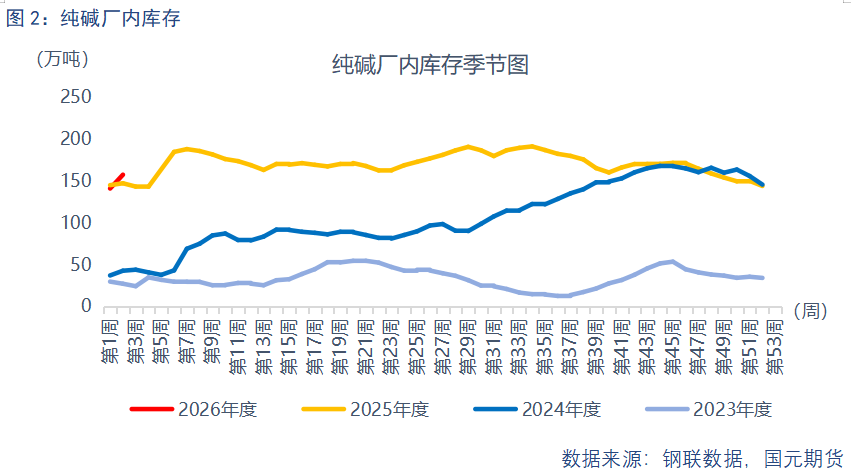 回归到纯碱需求方面,光伏玻璃生产吨耗纯碱约0.2吨,是纯碱的重要下游之一。目前光伏玻璃行业产能利用率偏低,表现出产能过剩的特征,对于光伏玻璃新增投产装置的提振有限,但现有装置产能利用率有提升预期。据钢联数据显示,截至2026年1月14日,光伏玻璃产能利用率跌至66.31%的低位,较2024年同期减少26.57个百分点,较2025年同期减少0.88个百分点。同时,尽管光伏玻璃企业库存维持在30天-40天的高位,且距离政策生效仍有超过70天缓冲期,预计光伏玻璃产量及销量将获得阶段性提振,进而对纯碱形成短期利好,改善市场心态。