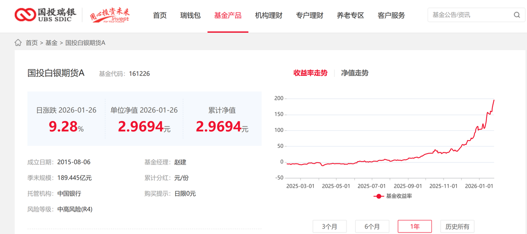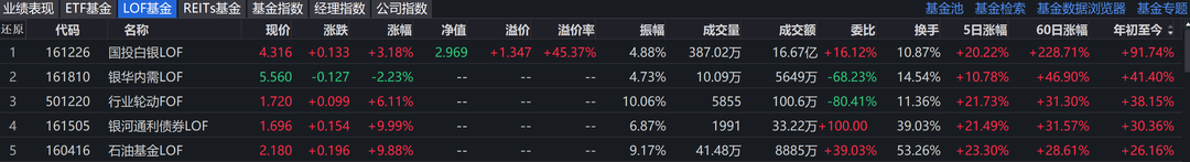 2025年全年,白银价格上涨近150%,涨幅大大超过黄金。进入2026年也一路“狂飙”。以国投白银LOF为例,2026年初至今涨逾90%,5日涨幅约20%,60日涨幅逾220%,稳居LOF基金涨幅榜首。
