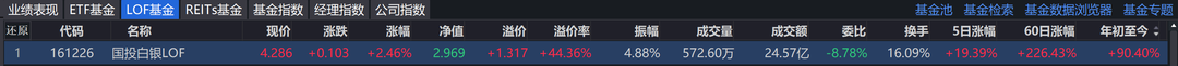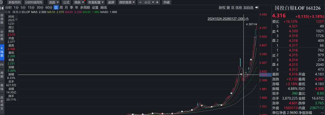 就在这份公告发布没几天,上述数值又都大幅上涨。扬子晚报/紫牛新闻记者查询发现,1月27日,国投白银LOF复牌后冲高回落,二级市场盘中交易价触及4.387元,再创新高。下午近14点,盘中交易价回落至4.286元,而该基金1月26日的单位净值为2.9694,溢价率达44.36%。
