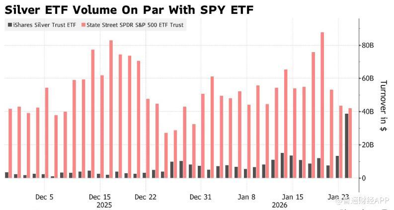 这一成交规模几乎与全球最大ETF之一,道富环球旗下的SPDR标普500ETF相当,同时也超过了英伟达(NVDA.US)股票约230亿美元的成交额,以及特斯拉(TSLA.US)约220亿美元的单日换手水平,凸显市场对白银资产的追逐已进入异常火热阶段。