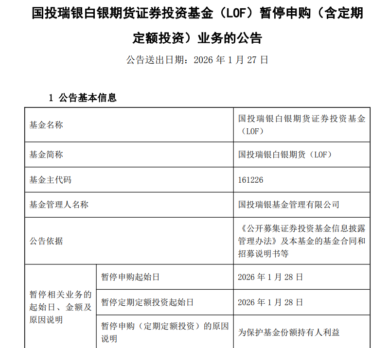 1月26日晚间,国投瑞银基金发布公告称,为保护基金份额持有人利益,国投瑞银白银LOF(下称“国投白银LOF”)将于1月28日起暂停申购(含定期定额投资)业务。这也意味着,这一公募市场唯一主要投资白银期货的LOF产品将暂时对新增资金关上大门。