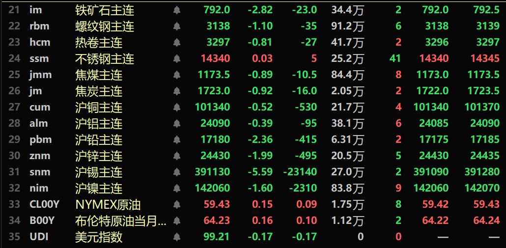截至午间收盘,内盘基本金属全线走弱,沪铜跌0.52%。沪铝跌0.39%。沪铅跌2.36%,沪锌跌1.99%。沪锡跌5.59%。沪镍跌1.6%。