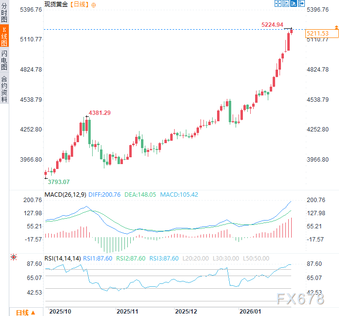 周三亚市时段,现货黄金震荡上行,连续第八个交易日上涨,此前一度创下5224.94美元/盎司的历史新高,现交投于5210美元附近,日内涨幅约0.55%。