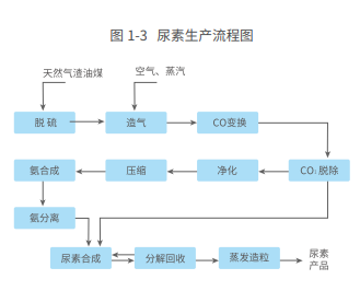 我国尿素生产原料以煤和天然气为主,2020年,全国尿素产能6913万吨。以煤为原料的尿素(简称煤头尿素)产能5095万吨,占比73%;以天然气为原料的尿素(简称气头尿素)产能1818万吨,占比26%;此外,还有少部分尿素产能以焦炉气为原料,约占总产能.的不足1%。其生产流程见图1-3。