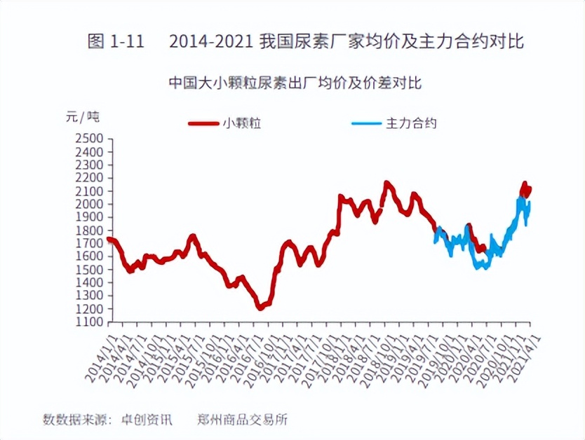 尿素产品集周期性、季节性、地区性等供需矛盾于一身,兼具农业、工业概念,还与能源密切相关,其价格受原料成本、供需结构变化、经济运行周期、国际市场变动等多重因素的影响,波动较频繁,2014年以来尿素价格最高达到2146元/吨(2021年3月2日),最低为1194元/吨(2016年8月15) , 历年价格波幅均在20%以上(见图1-11)。