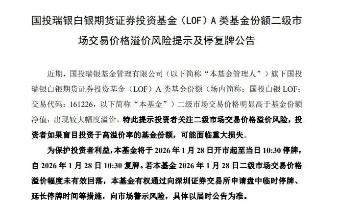 另外,1月27日,国投白银LOF公告,本基金将于2026年1月28日开市起至当日10:30停牌,自2026年1月28日10:30复牌。若本基金2026年1月28日二级市场交易价格溢价幅度未有效回落,本基金有权通过向深圳证券交易所申请盘中临时停牌、延长停牌时间等措施,向市场警示风险,具体以届时公告为准。