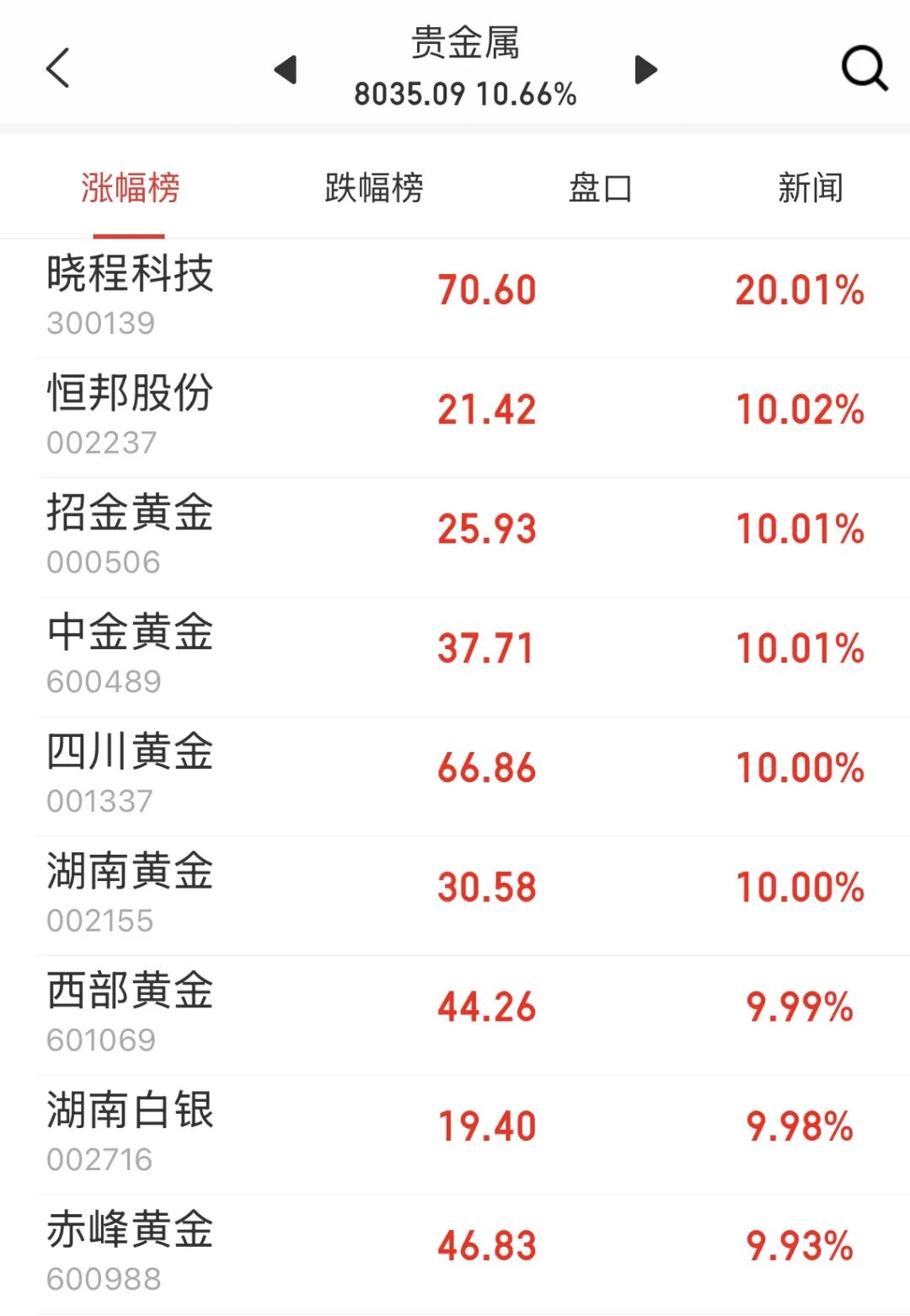 1月28日,在A股和港股市场方面,黄金股多数走强。截至发稿前,A股贵金属板块再次位列板块涨幅第一,指数暴涨逾10%,再创历史新高。个股方面,晓程科技20cm涨停,另有多股封死在涨停板上。