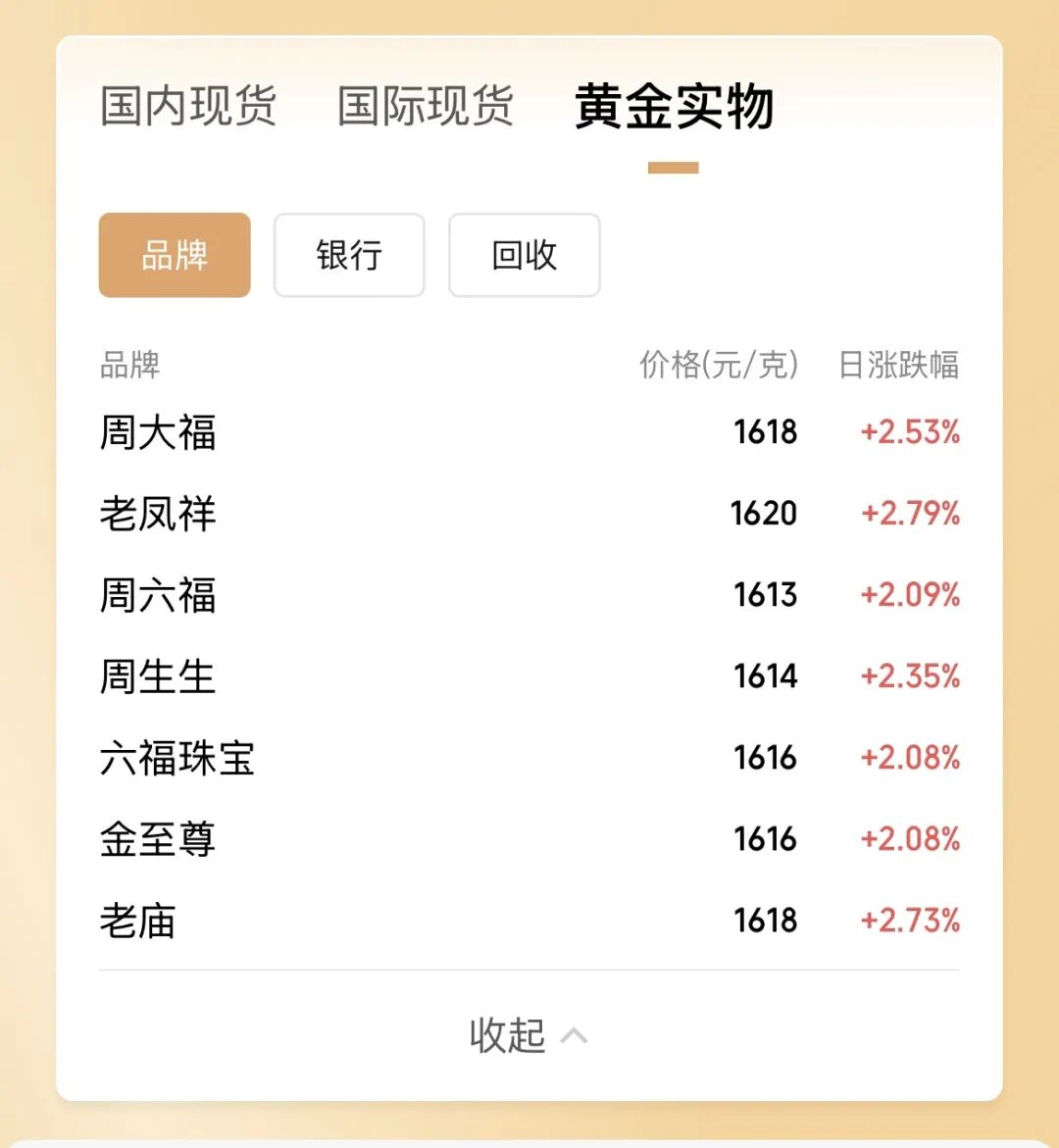 与此同时,国内多个各大黄金珠宝品牌的足金金饰也行至历史高位,集体站上1600元/克。今天,老凤祥黄金足金饰品报价1620元/克;周大福金饰报价1618元/克;老庙黄金足金饰品报价1618元/克;周生生金饰价格为1614元/克。