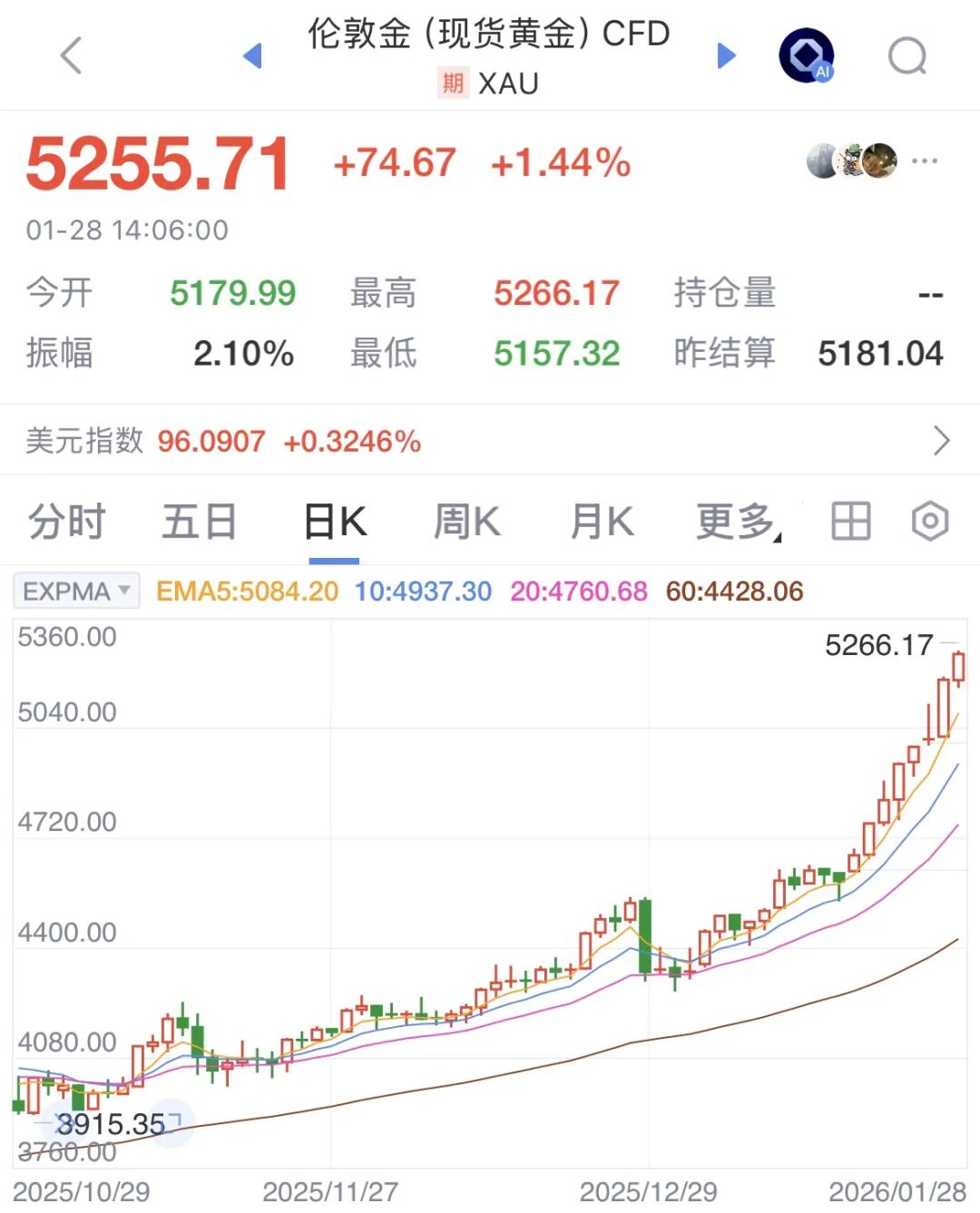 1月28日,现货黄金延续涨势,一路狂飙,突破5260美元/盎司,刷新纪录。截至发稿前,5255.71美元/盎司,上涨1.44%;现货白银则大涨2.68%,报116.08美元/盎司。
