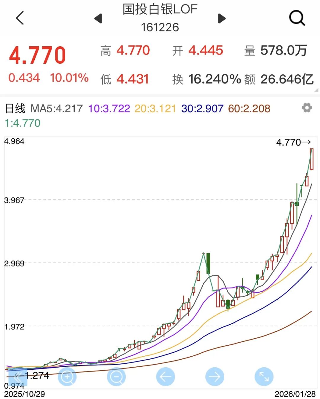 更疯狂的是,1月28日10:30,国投白银LOF复牌后继续上涨,发稿前已涨停,创出4.77元的新高。