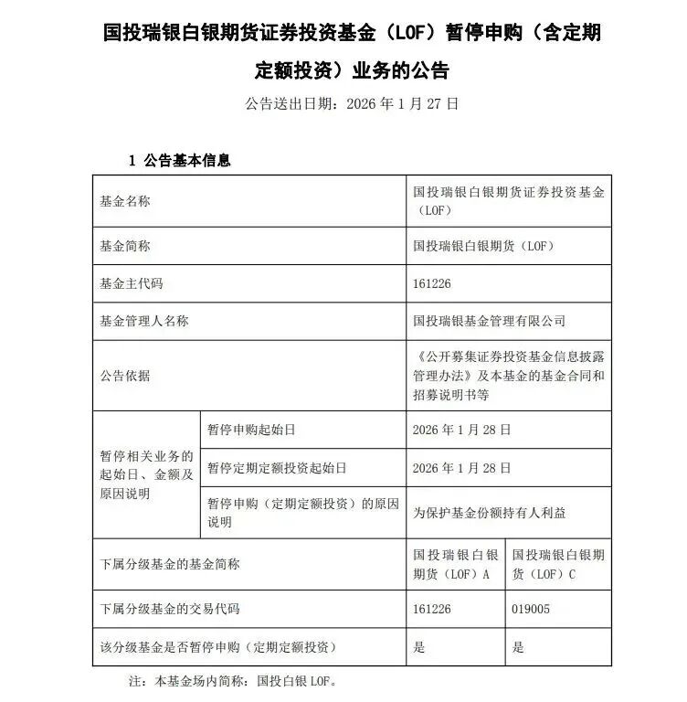 此前,国投白银LOF公告,将于1月28日起暂停申购(含定期定额投资)业务。