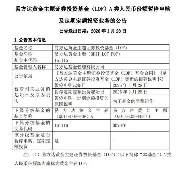 1月27日,易方达黄金主题LOF公告,1月28日起暂停A类人民币份额申购及定期定额投资业务。