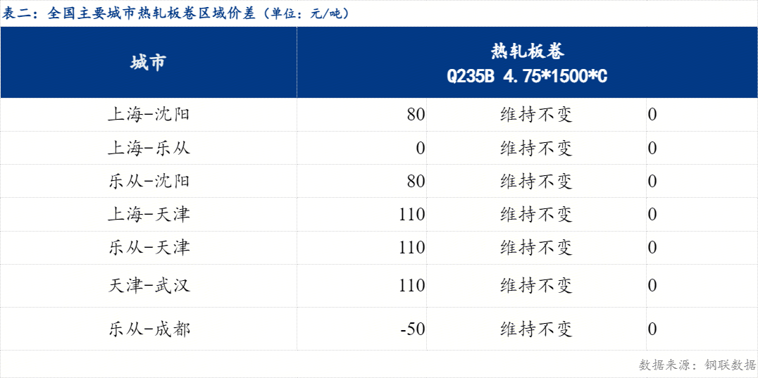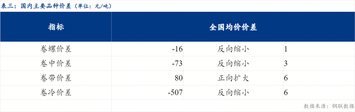 从品种价差来看,卷螺差较上一交易日反向缩小1元/吨,热中价差较上一交易日反向缩小3元/吨 ,热带价差较上一交易日正向扩大6元/吨 ,热冷价差较上一交易日反向缩小6元/吨。