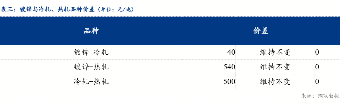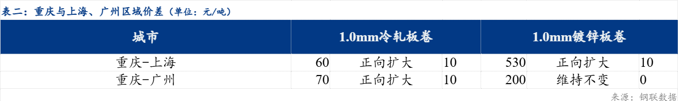 重庆、上海地区冷轧板卷区域价差正向扩大10元/吨;重庆、广州冷轧板卷区域价差正向扩大10元/吨。重庆、上海镀锌板卷区域价差正向扩大10元/吨;重庆、广州镀锌板卷区域价差维持不变0元/吨。镀锌、冷轧品种价差维持不变0元/吨;镀锌、热轧品种价差维持不变0元/吨;冷轧、热轧品种价差维持不变0元/吨。