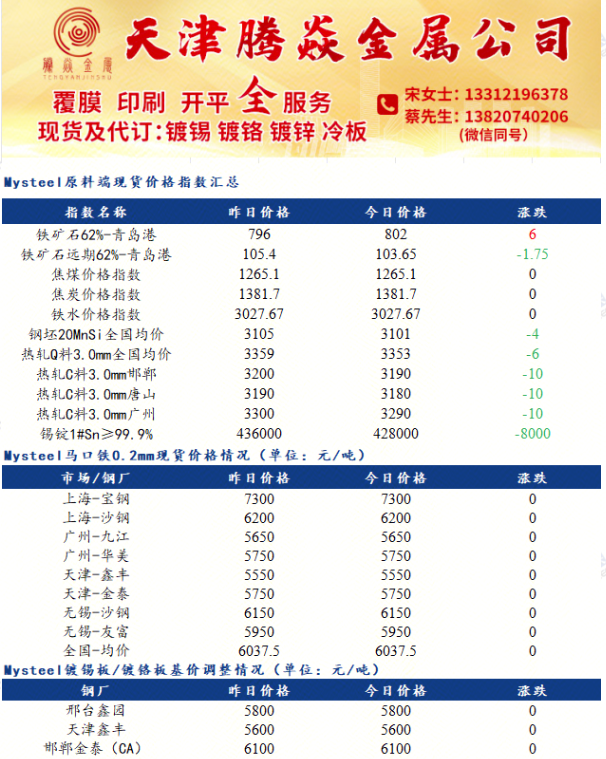 【今日价格】 今日三大主流市场镀锡板现货价格暂稳,上海、广州、天津市场现货报价分别为8050元/吨(宝钢股份),7350元/吨(太平洋),6600元/吨(邯郸金泰)。 【原料价格】 有色镀层方面:今日原料锡锭价格大幅上涨,三大主流市场均上涨8000元/吨 ;钢材基板方面:原料热轧基板现货价格震荡上行,三大主流市场调整幅度最大为广州、天津市场,涨幅50元/吨;冷轧基板钢厂调价持稳。 【钢厂调价】 今日镀锡板钢厂出厂价暂稳。 【市场总结】 今日黑色系期货价格宽幅上行,镀锡板原料锡锭、热轧基...