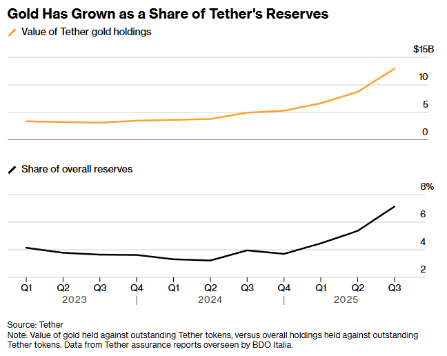 不过,Tether只是更广泛购金浪潮中的一小部分。各国央行和ETF投资者合计购买了超过1500吨黄金。世界黄金协会首席策略师约翰.里德表示,Tether的买盘确实对价格产生了影响,但只是金价大幅上涨的部分原因,“它们是这轮上涨的一个组成部分,但绝不是全部”。