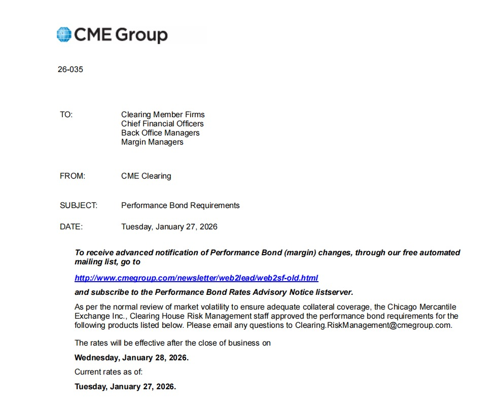 1月27日,CME发布26-035号文件,宣布对旗下白银、钯、铂三大金属期货产品的履约保证金(下称保证金)进行全面上调,新规将于今日(1月28日)收盘后正式生效。
