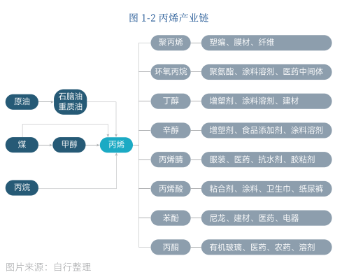 丙烯可用于生产多种重要有机化工原料,其中最主要的产品是聚丙烯,还可用于生产环氧丙烷、丁醇、辛醇、丙烯腈、丙烯酸苯酚、丙酮等,这些下游产品再经加工广泛应用于塑料、家电、汽车医疗器械、纺织等领域。