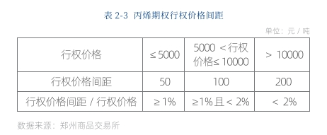 丙烯期权的行权价格间距根据行权价格分段设置,其设计主要是考虑到现货价格水平以及波动程度。行权价格间距过小会导致行权价格对应的期权合约数量过多,市场流动性较差;行权价格间距过大则会导致可供投资者选择的行权价格少,难以满足不同投资者的交易需求。丙烯期权以 5000 元/吨和 10000 元/吨分段设置了不同的行权价格间距,行权价格间距与行权价格的比值在 1% 至 2% 之间,与国际成熟市场惯例保持一致。