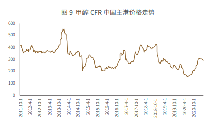 进口甲醇价格和华东甲醇现货价格呈现高度正相关,走势基本上 一致,只是阶段性的涨跌幅度会有一些差别:2011 年四季度至 2013 年上半年,进口甲醇价格窄幅震荡;2013 年下半年,外盘货源紧张, CFR 中国主港价格最高涨至 550 美元 / 吨。2014-2015 年,受国际原 油、天然气价格暴跌影响,进口甲醇价格大幅下挫,CFR 中国主港价 格从 2014 年初的 530 美元 / 吨,跌至 2015 年末的 200 美元 / 吨, 跌幅 63%。2016-2018 年三季度,受国内外宏观经济企稳回升影响, 国际原油、天然气价格企稳反弹,甲醇成本提升,进口甲醇价格重心 抬升,CFR 中国主港价格从 2016 年初的 200 美元 / 吨,涨至 2018 年 10 月份的 425 美元 / 吨,涨幅 113%。2018 年四季度开始,国内外宏 观经济预期转弱,原油天然气价格下跌,伊朗装置投产,再加上 2020 年全球疫情蔓延,进口甲醇价格持续下跌,CFR 中国主港价格从 2018年 10 月初的 425 美元 / 吨,下跌至 2020 年二季度的 153 美元 / 吨, 跌幅 64%,随后在疫情好转以及原油上涨等宏观因素带动下,进口甲 醇价格触底反弹,2020 年底 CFR 中国主港价格突破 300 美元 / 吨。