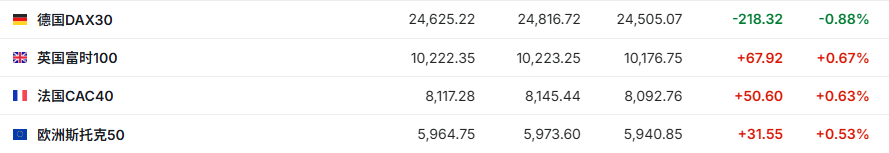 2. 截至发稿,德国DAX指数跌0.88%,英国富时100指数涨0.67%,法国CAC40指数涨0.63%,欧洲斯托克50指数涨0.53%。