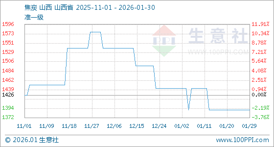 1月30日,生意社焦炭基准价为1391.25元/吨,与本月初(1442.50元/吨)相比,下降了3.55%。