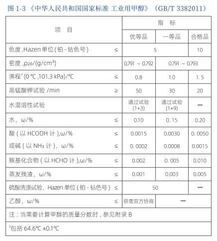 甲醇现行国家标准为《中华人民共和国国家标准工业用甲醇》(GB/T338-2011)。该标准适用于工业甲醇,将甲醇分为优等品一等品和合格品,质量指标包括色度、密度、沸程、高锰酸钾试验水混溶性试验等 11 个,具体应符合图 1-3 所示技术要求。