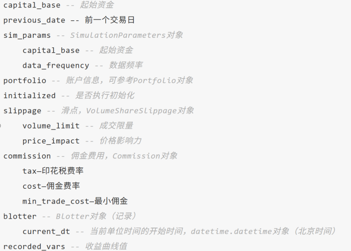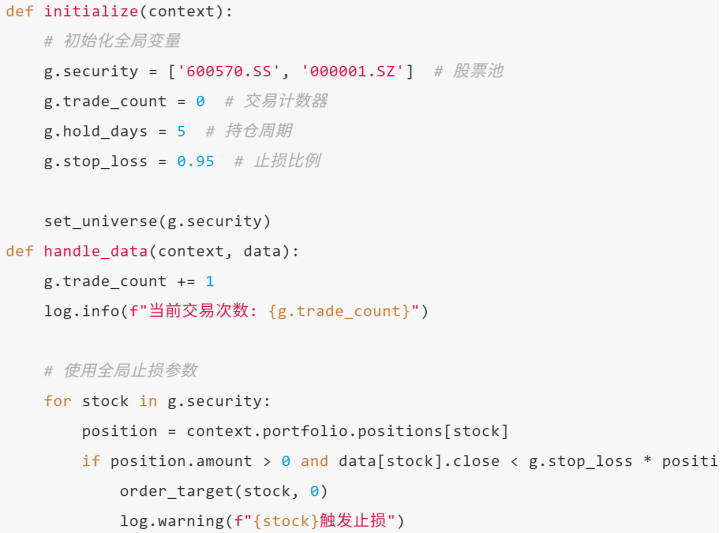 使用场景:在回测和交易模块中存储全局变量,实现跨函数数据共享。