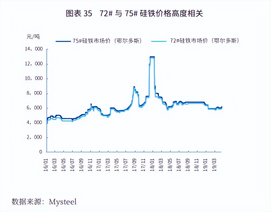 只要企业生产的产品和期货基准交割品的交割具备较强的相关 性,就可以利用期货合约进行套期保值。以硅铁为例,虽然基准交割 品为 72# 硅铁,但是 75# 硅铁和其相关性很高,达到了 0.998,两者价差非常稳定。