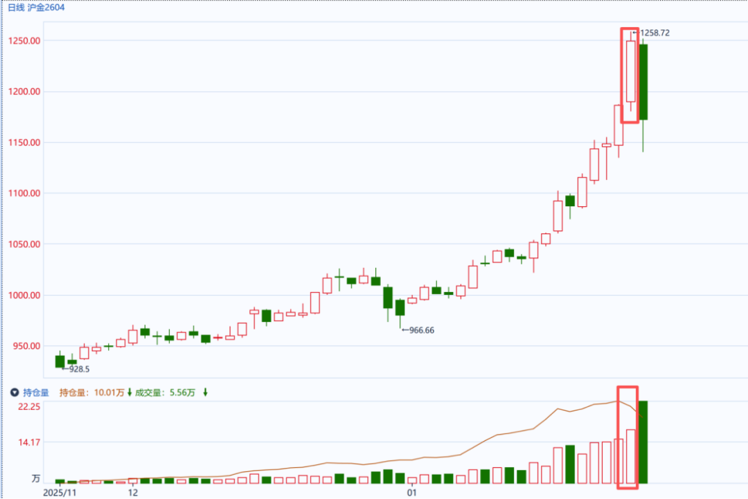 昨日沪金主力Au2604合约收盘,出现了典型的技术风险信号——胀爆形态:价格经过长期上涨后,突然急剧上冲,同时成交量放大,但持仓量却显著下降。这是短期多头动能衰竭的典型信号!