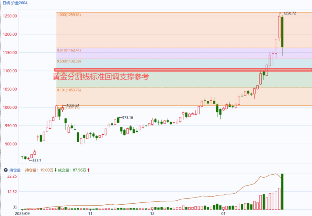 尽管长期看多黄金的逻辑尚未根本逆转(美元信用下降引发的全球购金潮+降息周期的开启),黄金短期“驱动上涨”的行情似乎已现动摇,后续关注此轮回调幅度,如若有效跌穿黄金分割线0.382分位点附近的支撑(对应沪金主力合约1100整数关口附近),则须警惕金价短期走势逻辑转变的可能。