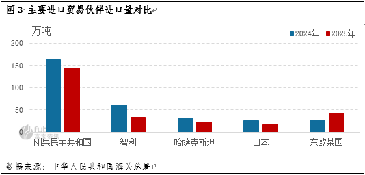 2025年较为显著的变化是进口来源地的重构。刚果(金)已稳固其作为中国最大电解铜供应国的地位,全年进口量达144.1万吨,占总量的37.64%,其中11月单月进口14.36万吨,创下年内高点。与此同时,东欧某国进口量从去年同期25.43万吨增至42.59万吨,增幅达67.50%,成为进口来源国的一大增长极。
