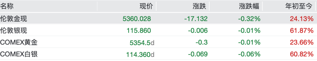 1月30日,截至北京时间9:30,黄金白银全线飘绿,现货黄金回落至5360美元/盎司附近,此前最高触及5453美元。