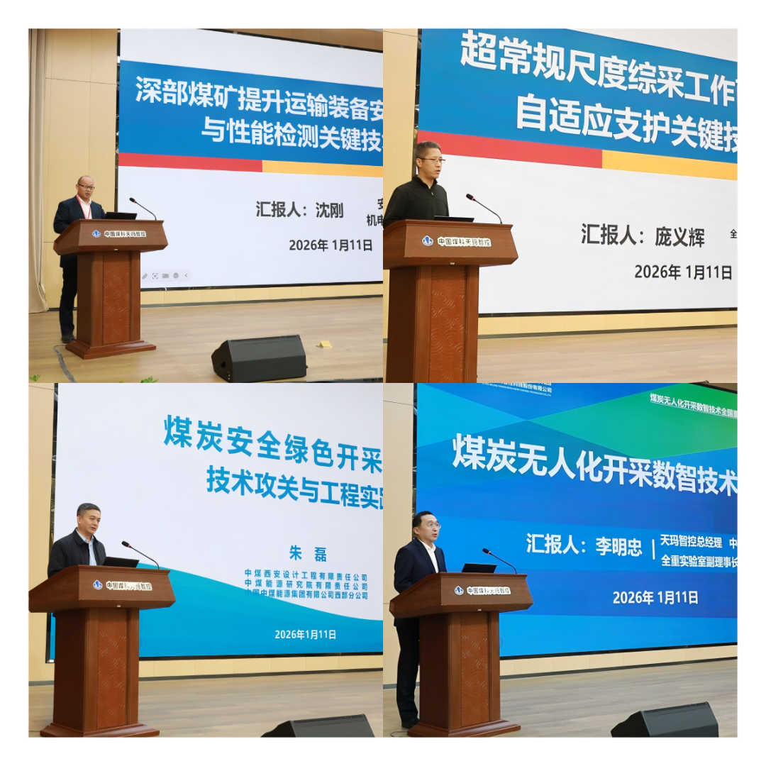 会上,天玛智控党委副书记、总经理、中国煤科首席科学家、全重副理事长李明忠,煤炭科学研究总院有限公司首席科学家、全重副主任庞义辉,中煤西安设计公司总经理、全重研发中心主任朱磊,安徽理工大学教授、全重研究室主任沈刚,围绕“煤炭无人化开采数智技术与装备”“超常规尺度综采工作面围岩智能自适应支护关键技术研究”“煤炭安全绿色开采领域技术攻关与工程实践”“深部煤矿提升运输装备安全高效运行与性能检测关键技术研究”等主题分别作报告,介绍了个人基本情况、研究背景及意义、主要研究成果与进展以及后续研究方向和任务。
