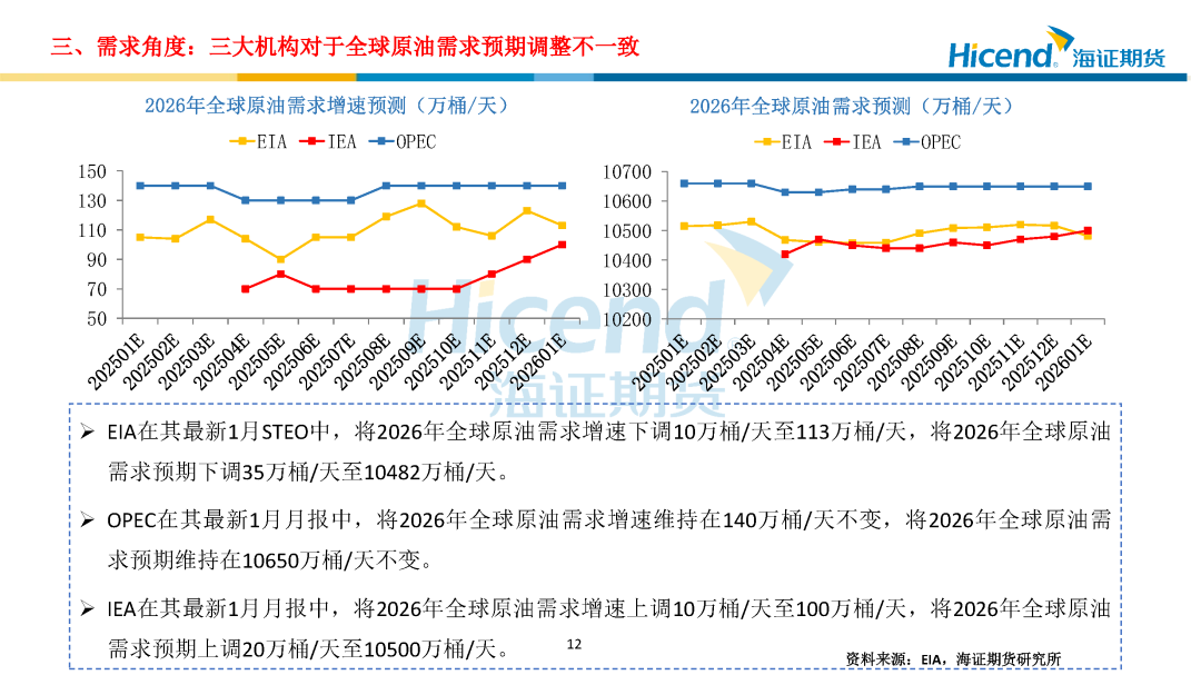 需求端,美国炼厂加工需求尚可,欧洲炼厂加工需求偏低,国内原油进口量较高,加工需求中性。三大机构对于全球原油需求预期调整不一致,EIA下调2026年全球原油需求预期,OPEC维持预期不变,IEA上调预期。关税后经济环境趋于稳定,我们将2026Q1全球原油需求预期上调0.1百万桶/天至103.4百万桶/天。
