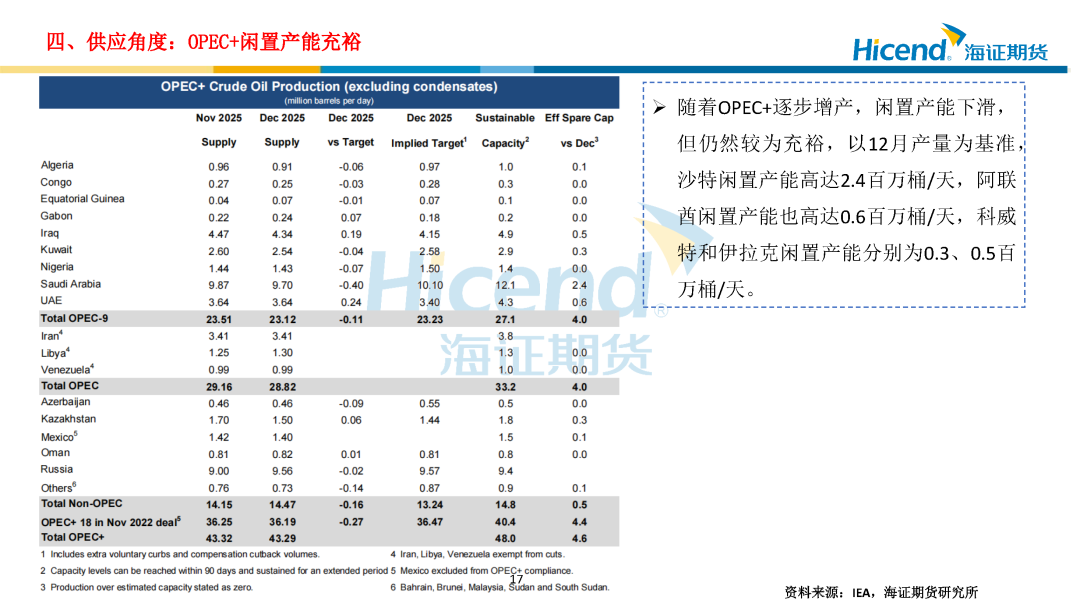 供给端,由于钻井活动放缓的速度将超过钻井生产率的提升,EIA预计美国原油产量将会减少,2025年1360万桶/天见顶,2026年降幅小于1%。12月,OPEC原油产量2856.4万桶/天,环比增加10.5万桶/天,EIA预计2026年全球液体燃料产量的增长由OPEC+的原油产量增长驱动,OPEC+闲置产能依然充裕。地缘方面,委内瑞拉事件对供应影响较小,伊朗不确定性较大,且需警惕行情反复。我们将2026年Q1全球原油总供应预期小幅下调0.2百万桶/天至107.03百万桶/天。