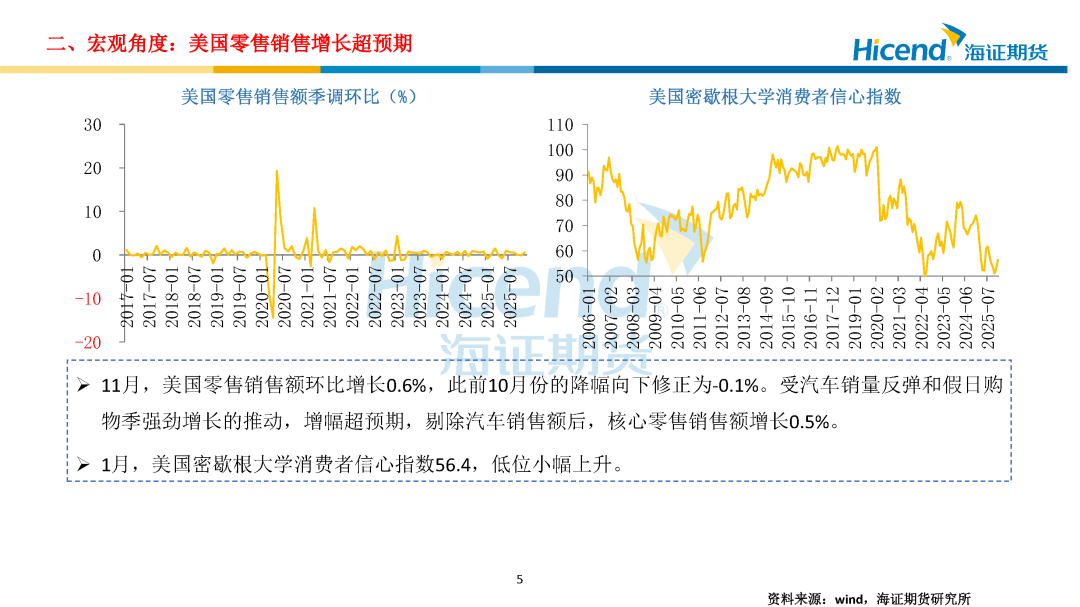 宏观面,美联储将基准利率维持在3.50%-3.75%不变,暂停了自去年9月以来的连续三次降息步伐。FOMC声明中,上调了对经济活动的评估,称其以稳健速度扩张,就业市场已显现出一些企稳迹象,预计关税通胀今年年中见顶。此次议息会议后,市场仍预计美联储今年年内将降息两次,且年内的首次降息或在二季度。