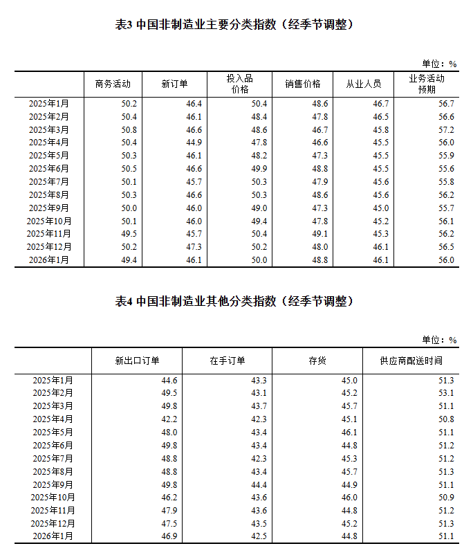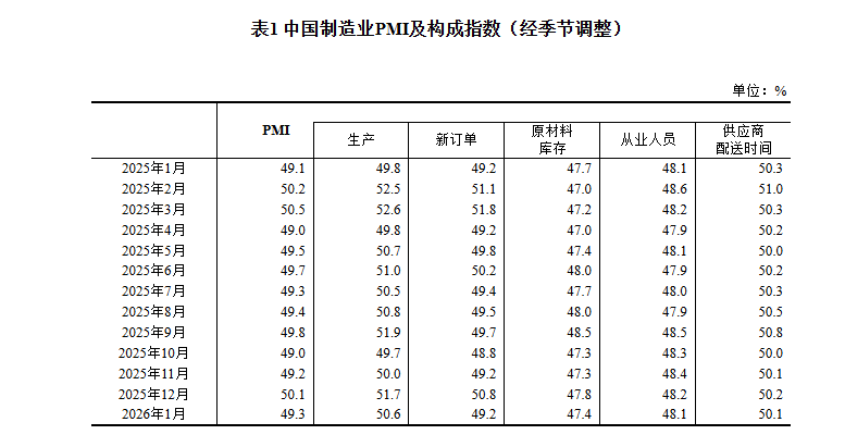 国家统计局、中国物流与采购联合会今天(31日)发布2026年1月份中国采购经理指数。2026年1月份中国制造业采购经理指数(PMI)为49.3%,比上月下降0.8个百分点。1月份装备制造业采购经理指数为50.1%,高技术制造业采购经理指数为52%,装备制造业和高技术制造业稳中向好发展,制造业产业结构持续优化。1月份非制造业商务活动指数为49.4%,比上月下降0.8个百分点。