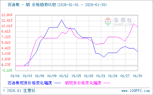 1月铝价表现依旧强劲。据生意社商品行情分析系统,截止2026年1月30日国内铝锭华东市场均价24666.67元/吨,较1月1日市场均价22473.33元/吨,上涨9.76%。春节前下游加工企业陆续放假,传统消费淡季叠加高价抑制采购意愿,铝锭社库持续累积(截至1月28日国内社库约79.6万吨,较上周累库2.8万吨,接近80万吨,高于去年同期),现货对期货合约贴水走阔,凸显下游观望情绪。下游铝用碳素对石油焦市场刚需为主。