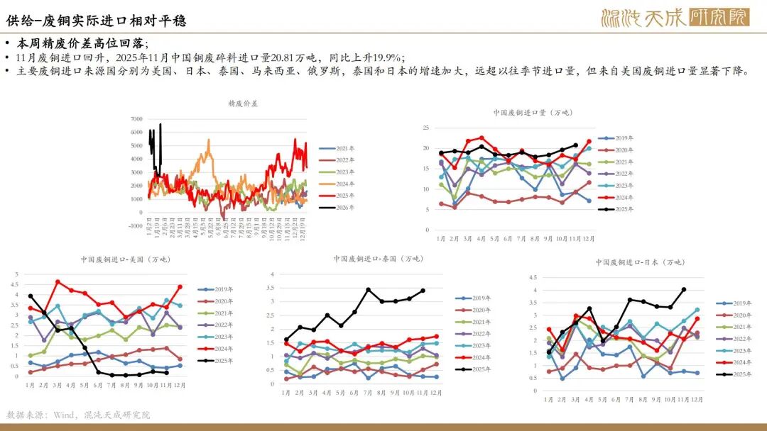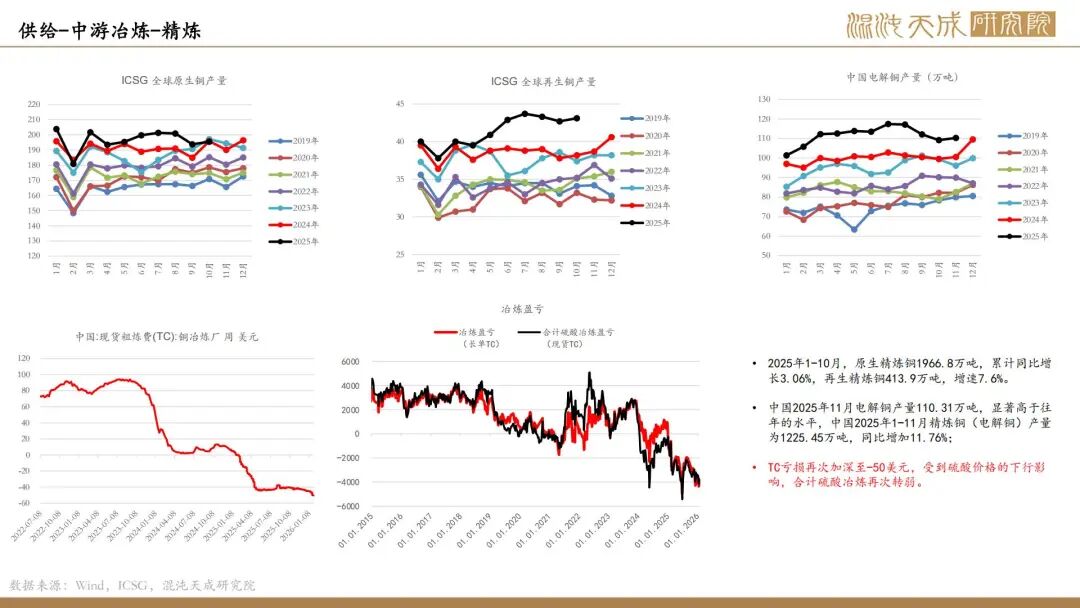 供应端:冶炼环境仍较差,部分冶炼厂仍面临亏损状态,TC已经持续下滑至-50美金,含硫酸的冶炼利润再次转弱明显。矿端仍存干扰,双方谈判无果,智利Mantoverde铜矿罢工将持续;Southern Copper预计未来两年公司铜产量将出现下滑。