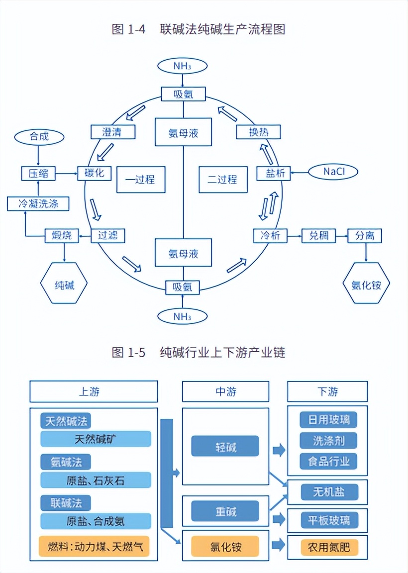 联碱法是在氨碱法工艺基础上改进发展而来,由我国“现代化工 先驱”侯德榜博士在 1938 年创立,其上游主要是原盐与合成氨。该 方法通过与氨厂进行“一次加盐、两次吸氨、一次碳化”联合循环生产, 利用氨厂 NH3 和 CO2 同时生产出纯碱和氯化铵两种产品。联碱法克服 了氨碱法的缺点,原盐利用率大幅提升,无需石灰石和焦炭(煤), 节约了燃料、原料、能源和运输费用,同时避免了大量废渣和废液的 排放,其副产品氯化铵还可用于氮素化学肥料、电池制造、电镀和印 染等。