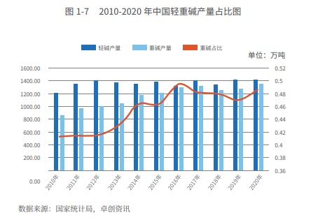 2020 年我国轻碱产量 1417 万吨,重碱产量 1342 万吨。2010- 2020 年,重碱产量占比从 41.3% 增长至 48.7%,重碱的产量增速远 远高于轻碱。