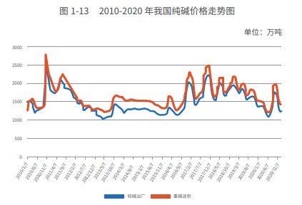 纯碱价格变动与国家宏观经济走向息息相关。20 世纪 90 年代, 受纯碱产能爆发式增长和纯碱下游需求逐渐提升的先后影响,我国纯 碱价格经历了由高到低、再由低回升的过程。2000 年以来,纯碱价格 受原料成本、供需结构变化、经济运行周期、环保政策变动等多重因 素影响,波动较频繁。2010 年至 2020 年间,重质纯碱最高价 2800 元 / 吨,最低价 1230 元 / 吨,价格波动幅度达到 128%,年平均波幅为46%。
